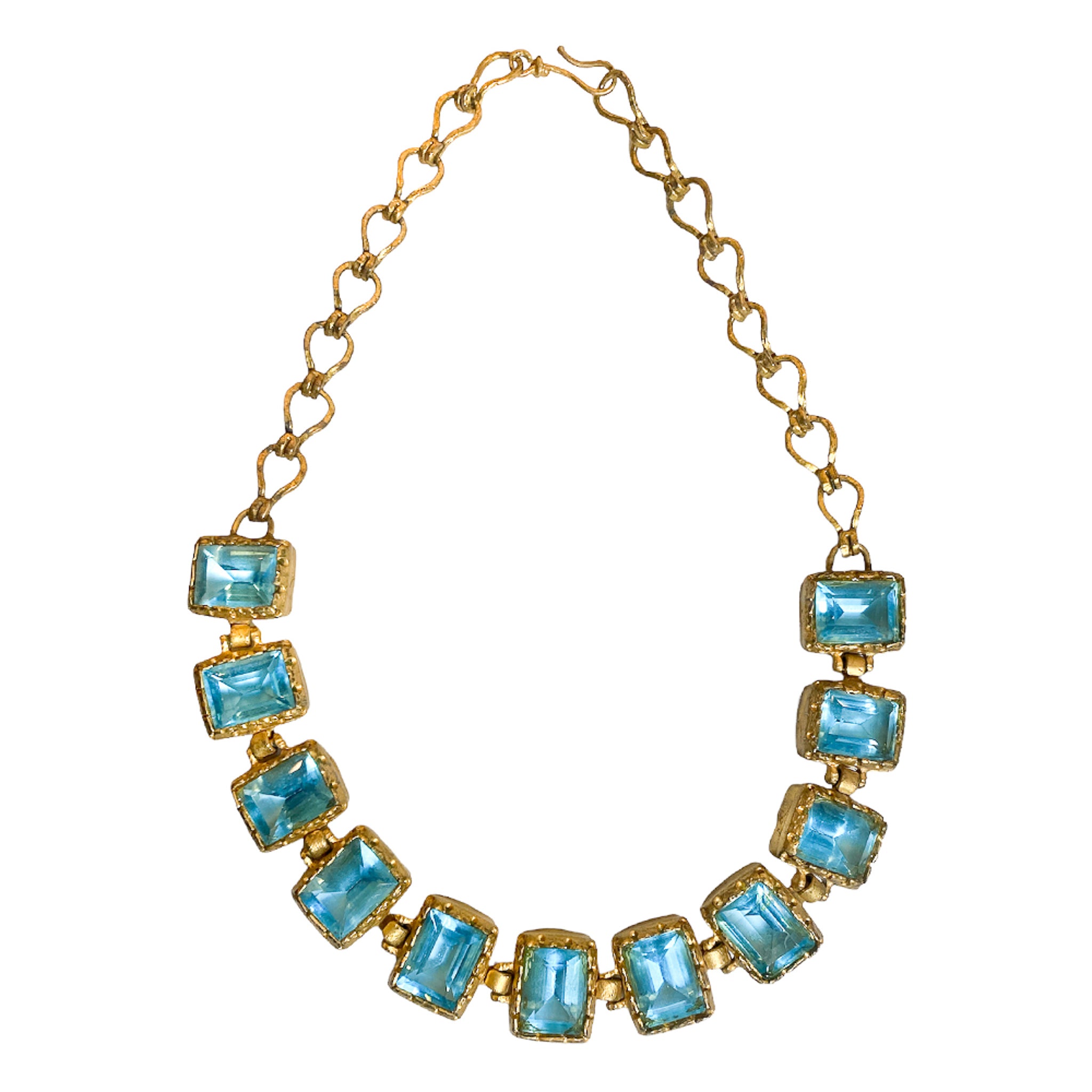 Handmade blue zircon necklace made out of bronze, plated by 18K-24K goldOxidized to have a unique historical character