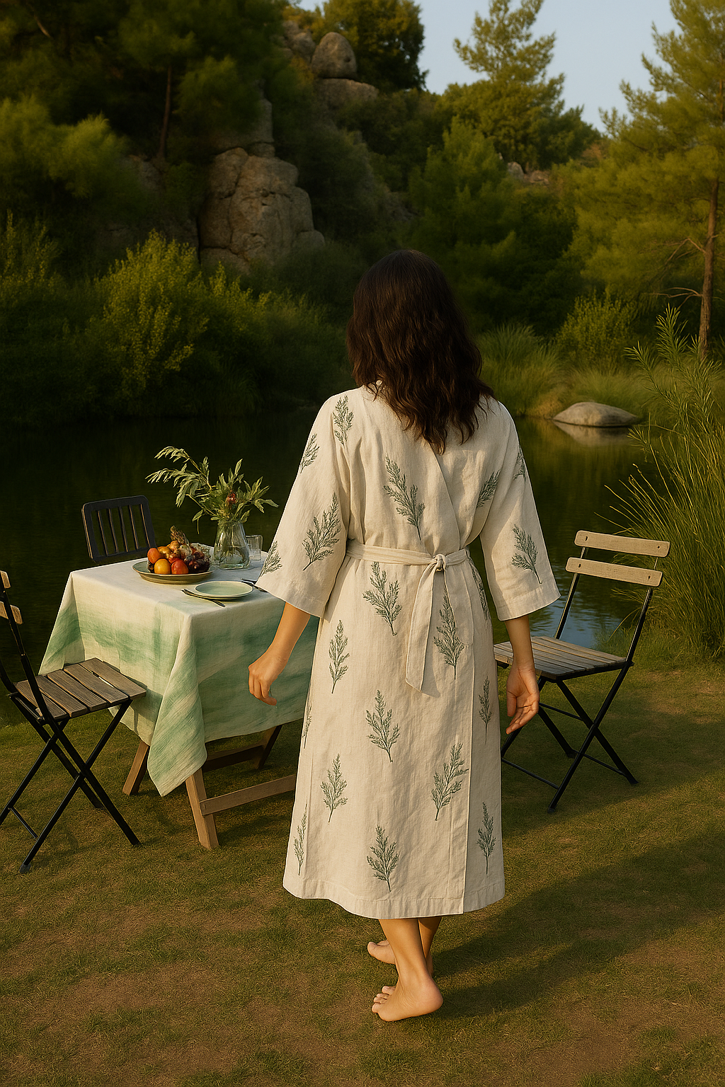 Wrap yourself in artisanal elegance with this handcrafted linen kimono. Made from 100% natural linen, each piece is individually block-printed by hand using the traditional linocut technique. The botanical motifs are first carved into linoleum blocks, then carefully pressed onto the fabric — making every kimono a unique work of wearable art.