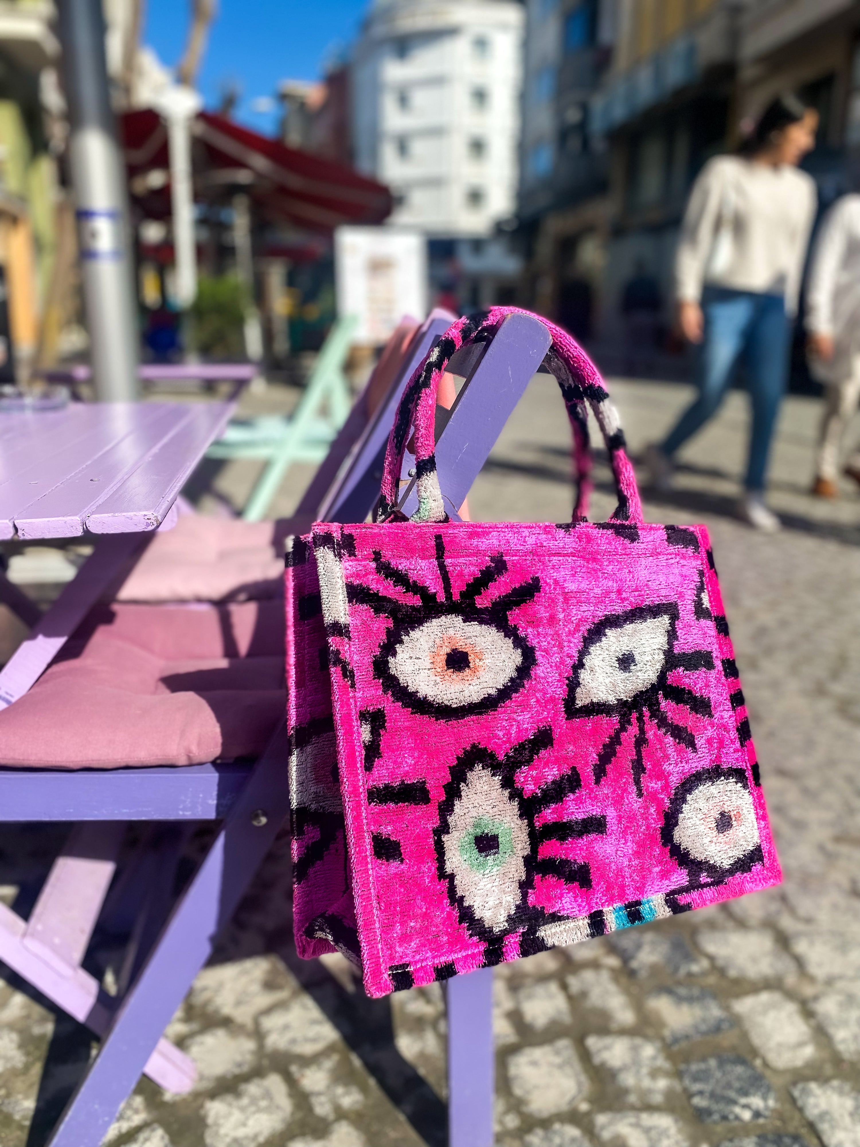 Experience luxury and tradition with our "Velvet Ikat" tote bag! Hand-woven with silk and finished with elegant piping, it's a blend of sought-after styles and local heritage. Inspired by Ottoman designs, it embodies our brand's unique spirit.